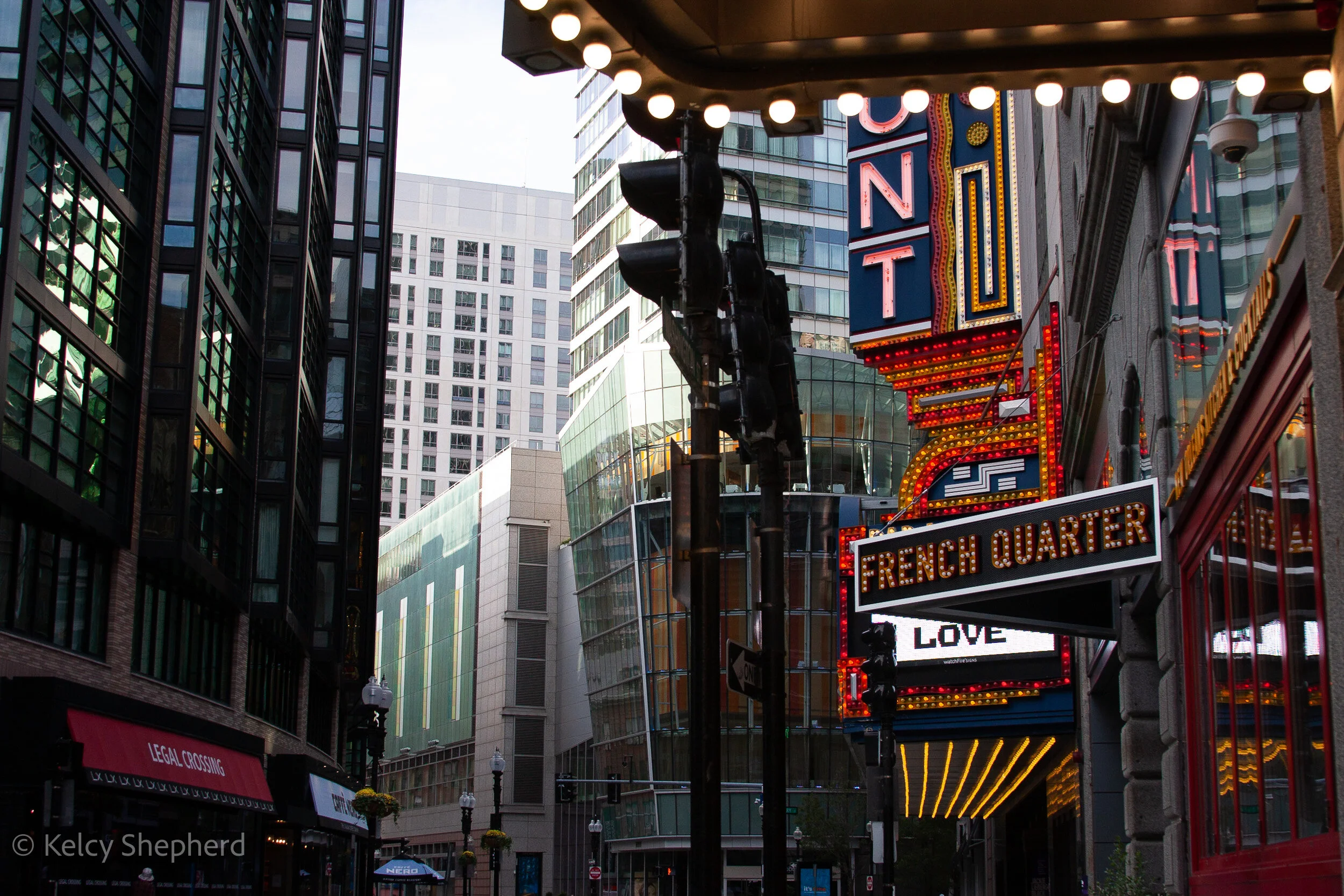 2. Washington Street looking south with focus on marquee lights of French Quarter restaurant. October 2021. Boston, Massachusetts. Photo by Kelcy Shepherd.